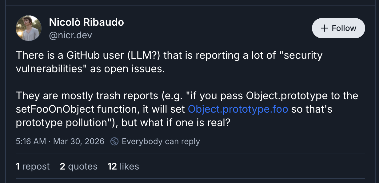 In the old world, the literal human cost to discover and report these issues served as a good speed bump to keep the workload somewhat manageable. But now people are generating 10s and 100s of reports on projects without any thought at all. The security researchers that care are now even fewer in number. It’s even more about getting as many clout points as you can. And the approach is to blast every project you can find with automated reports so that they can sneak past the few projects that are willing to do proper due diligence for every report.